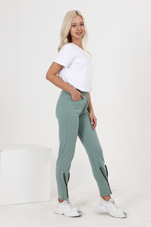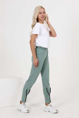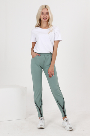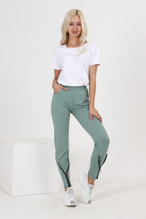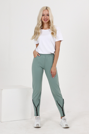 Брюки полуприлегающего силуэта, с боковыми карманами, на эластичном поясе. В нижней части передних половинок обработаны декоративные элементы с молниями.