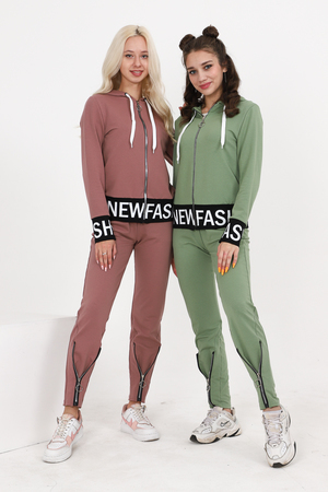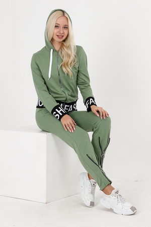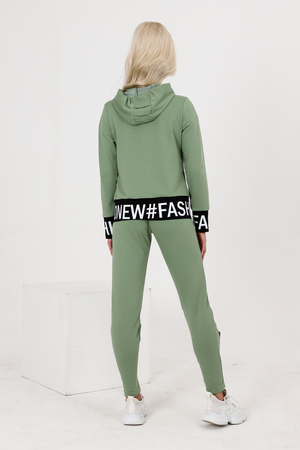 Костюм состоит из толстовки и брюк. Толстовка прямая, полуприталенная, с капюшоном, на молнии, на поясе. Рукав втачной, длинный, на манжете. Пояс куртки и манжеты рукавов выполнены из контрастного полотна с принтом. Брюки полуприлегающего силуэта, с боковыми карманами, на эластичном поясе. В нижней части передних половинок обработаны декоративные элементы с молниями.