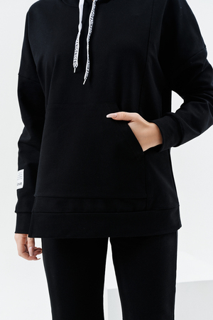 Толстовка прямая, свободная, с капюшоном, с фигурной линией низа на полочке. Рукав длинный, на манжете. На полочке расположен асимметричный карман "кенгуру".