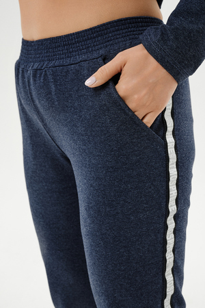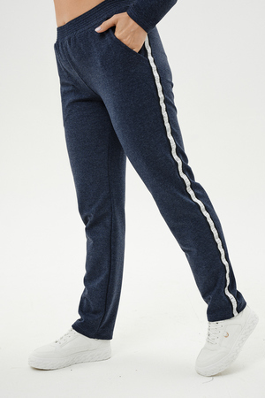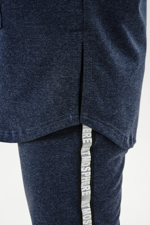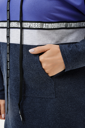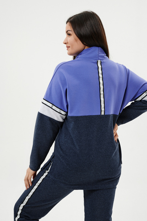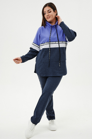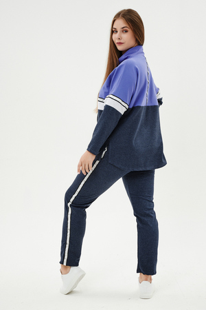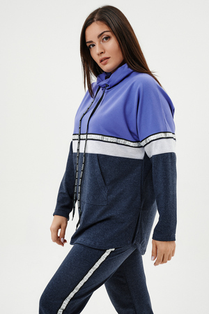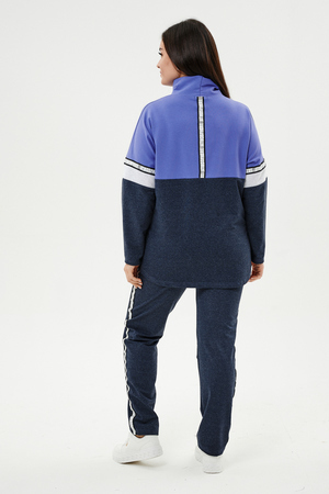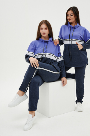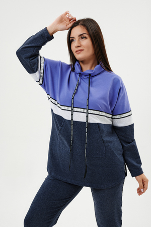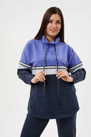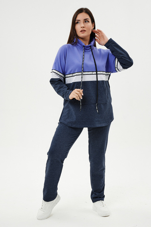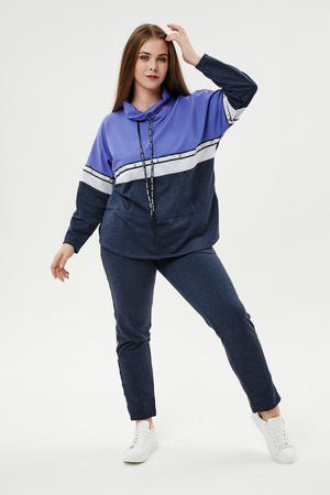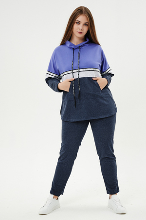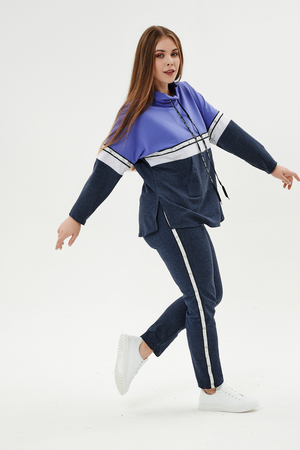 Костюм женский: толстовка и брюки. Туника прямого силуэта, брюки облегающие. Воротник стойка - хомут со шнурком. Карман - кенгуру. Верхняя и нижняя часть туники из разных тканей, посередине полочки и рукавов белая отделочная полоса с декоративной тесьмой. Брюки с внутренними карманами и лампасами из декоративной тесьмы.