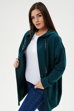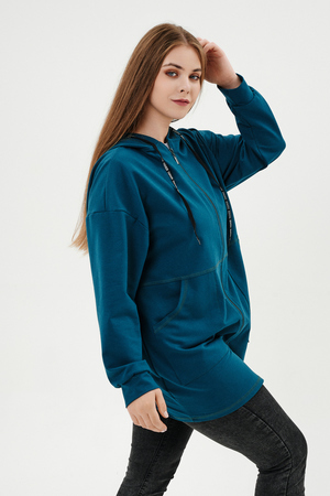 Толстовка женская прямого силуэта до линии бедер, в нижней части заужена по бокам. Рукав втачной с заниженной линией плеча, с манжетой. Капюшон с люверсами и декоративными шнурками. Застежка на тесьму-молнию. В нижней части полочки два накладных кармана. Цвет изумруд в разных оттенках.