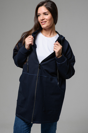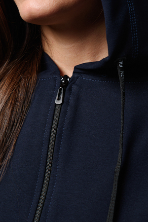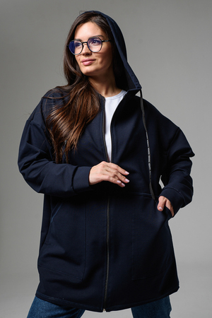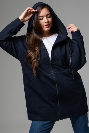 Толстовка женская прямого силуэта до линии бедер, в нижней части заужена по бокам. Рукав втачной с заниженной линией плеча, с манжетой. Капюшон с люверсами и декоративными шнурками. Застежка на тесьму-молнию. В нижней части полочки два накладных кармана. Цвет изумруд в разных оттенках.