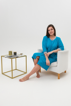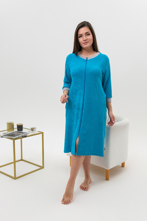 Халат женский из ткани махра хлопок 100%. Халат на молнии, с карманами, рукав 3/4, рукава и горловина отделаны рибаной меланжевого цвета. Вырез горловины V образный, покрой прямого силуэта. Халат предназначен для дома и отдыха.