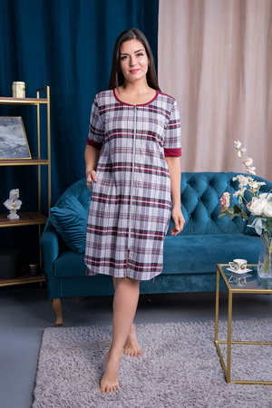 Халат на молнии с короткими рукавами и манжетами. Спинка с кокеткой и встречной складной. Низ изделия полукруглый спереди и удлиненный сзади. Карманы в боковых швах.
