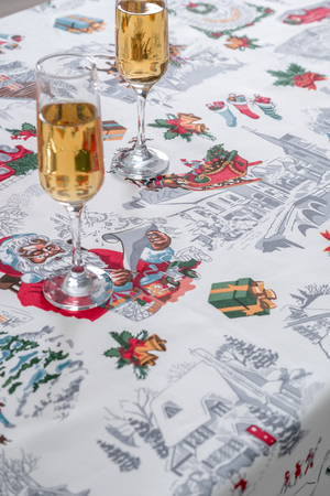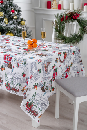 Белая скатерть с новогодней символикой внесет капельку волшебства в ваш дом. На светлом рогожковом полотне изображено множество новогодних атрибутов. Где-то Дедушка Мороз читает газету, а где-то олени развозят подарки по домам. Скатерть снежная зима будет радовать глаз не только в новогоднюю ночь, но и всю зиму. Ведь благодаря особому износостойкому материалу скатерть можно использовать и стирать хоть каждый день. В дополнение к скатерти можно заказать Набор полотенец Снежная зима.
