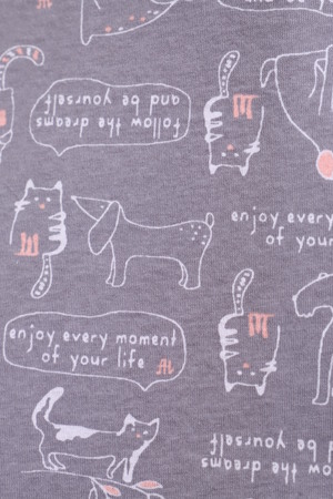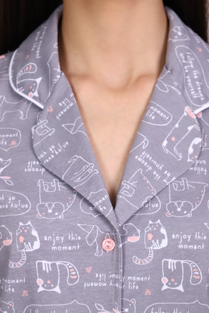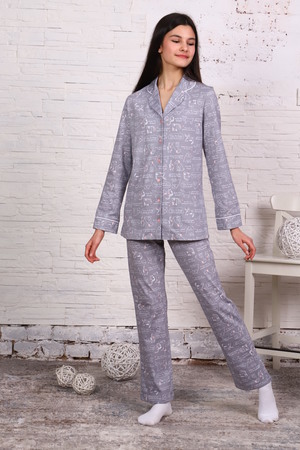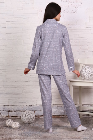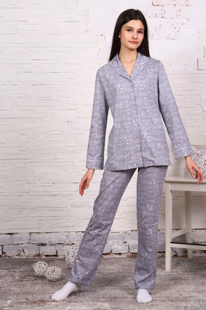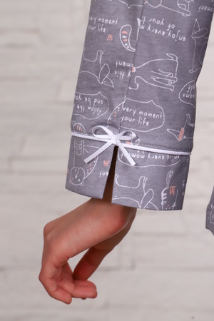 Комфортная хлопковая пижама-костюм с милым принтом. Рубашка с длинными рукавами имеет отложной воротник, застежку на пуговицы. Брюки с эластичным поясом и декоративным бантиком. На воротнике и рукавах - отделка белым кантом. Пижама приятна для тела и идеально подходит для отдыха дома и сна. Отличный подарок на День Рождения или 8 марта.