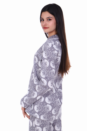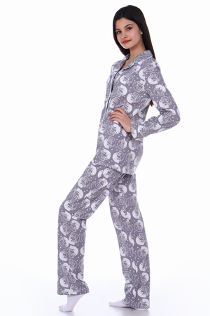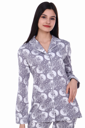 Комфортная хлопковая пижама-костюм с милым принтом. Рубашка с длинными рукавами имеет отложной воротник, застежку на пуговицы. Брюки с эластичным поясом и декоративным бантиком. На воротнике и рукавах - отделка белым кантом. Пижама приятна для тела и идеально подходит для отдыха дома и сна. Отличный подарок на День Рождения или 8 марта.