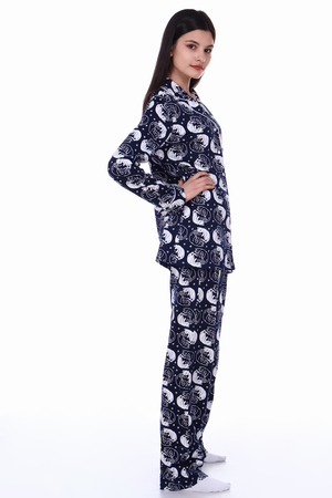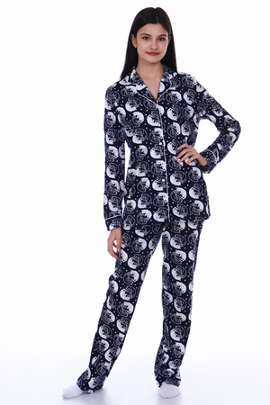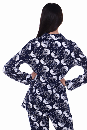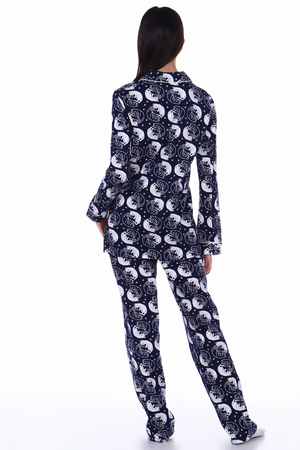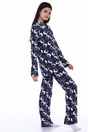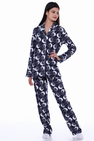 Комфортная хлопковая пижама-костюм с милым принтом. Рубашка с длинными рукавами имеет отложной воротник, застежку на пуговицы. Брюки с эластичным поясом и декоративным бантиком. На воротнике и рукавах - отделка белым кантом. Пижама приятна для тела и идеально подходит для отдыха дома и сна. Отличный подарок на День Рождения или 8 марта.