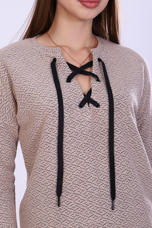 Джемпер женский из мягкого вязаного трикотажа. V-образный вырез горловины декорирован люверсами и шнуром, спущенная пройма, длинный рукав. Джемпер комфортный, универсальный, создаст неповторимый стиль для модницы любой фигуры и возраста. С наступлением холодов эта вещь становится основой всего базового гардероба, отличным офисным вариантом.
