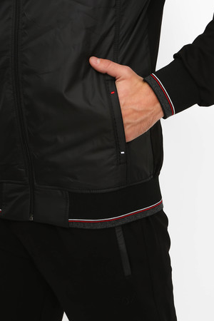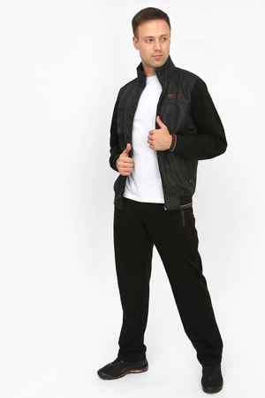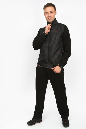Мужской спортивный костюм выполнен из трикотажа с добавлением плащевки. Карманы брюк и кофты на молнии с декоративной листочкой. Низ и рукава кофты на манжетах, брюки прямого кроя, на талии резинка внутри которой находиться веревка для регулирования, воротник стойка. Костюм отлично подойдет для тренировок, для повседневной носки, дачи и дома.