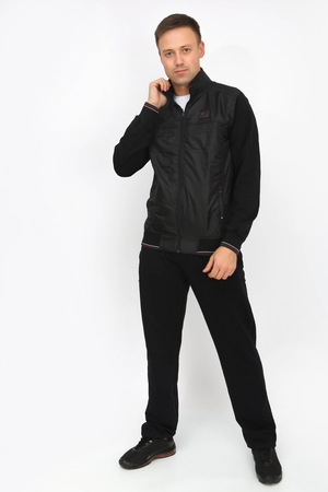 Мужской спортивный костюм выполнен из трикотажа с добавлением плащевки. Карманы брюк и кофты на молнии с декоративной листочкой. Низ и рукава кофты на манжетах, брюки прямого кроя, на талии резинка внутри которой находиться веревка для регулирования, воротник стойка. Костюм отлично подойдет для тренировок, для повседневной носки, дачи и дома.