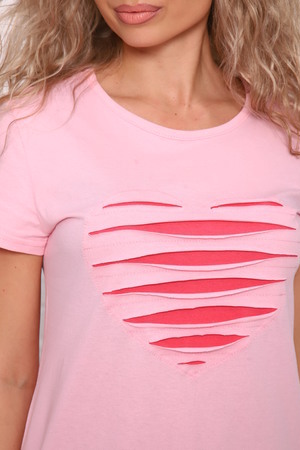 Туника из кулирки с добавлением лайкры. Рукава короткие, общая длина до середины бедра. На груди стилизованное изображение сердца из разрезов