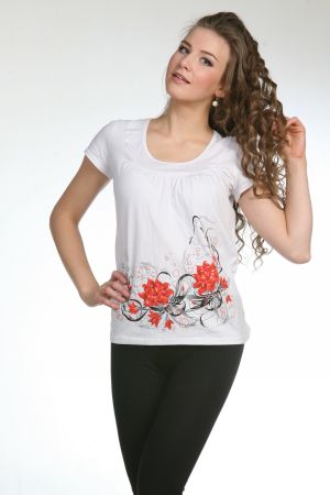 Футболка женская из кулирки. Светлая футболка с окантовкой в тон, спереди цветочный принт, рукава короткие. Размеры от 46 до 60. Возможен розничный заказ данного товара.