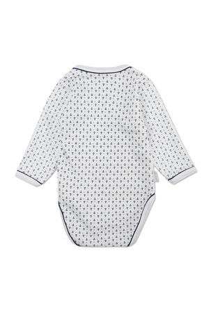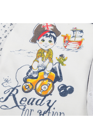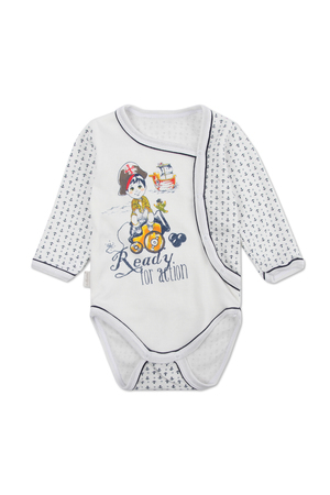Боди для мальчика. Выполнен из 100% хлопка. Ткань интерлок. Кнопки сбоку изделия и между ножек. Украшен принтом на водной основе.