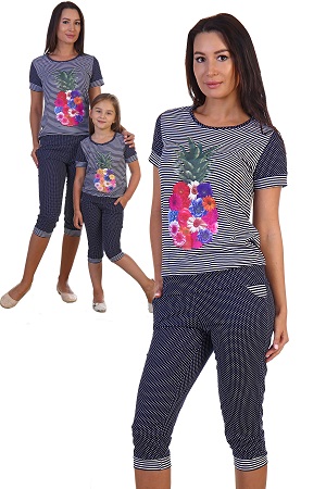 Костюм футболка + бриджи из кулирки. Полосатая футболка, рукава в крапинку, принт в виде ананаса из цветов. Бриджи в крапинку, полосатая отделка. Может быть парой детскому костюму 1796 (продается отдельно). Размеры от 42 до 56. Продается в розницу.