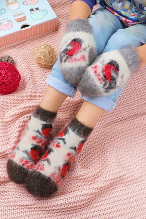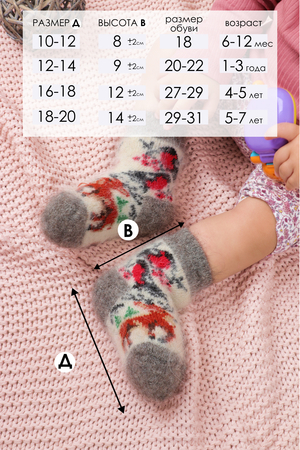 Детские шерстяные носки, мягкие, пушистые изготовлены из 50% козьего пуха и 50% шерсти. В упаковке 1 пара, три размера на выбор. Тематика птицы, животные, орнамент - на выбор.