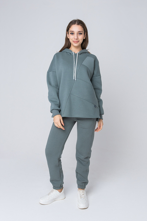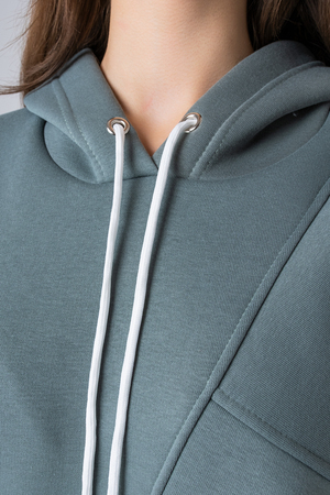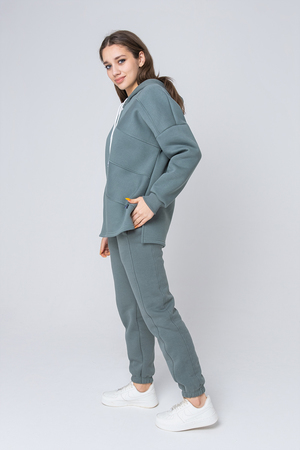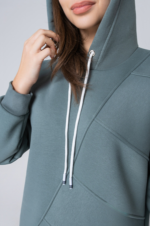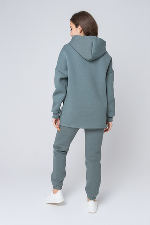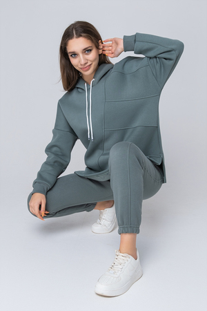 Толстовка утепленная, прямая, свободная, с удлиненной спинкой, с капюшоном. Рукав длинный, на эластичном манжете. В нижней части боковых швов обработаны разрезы.