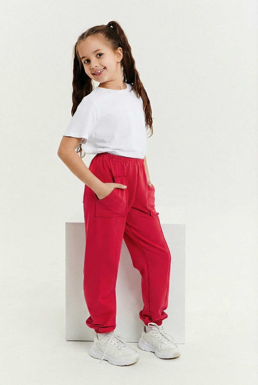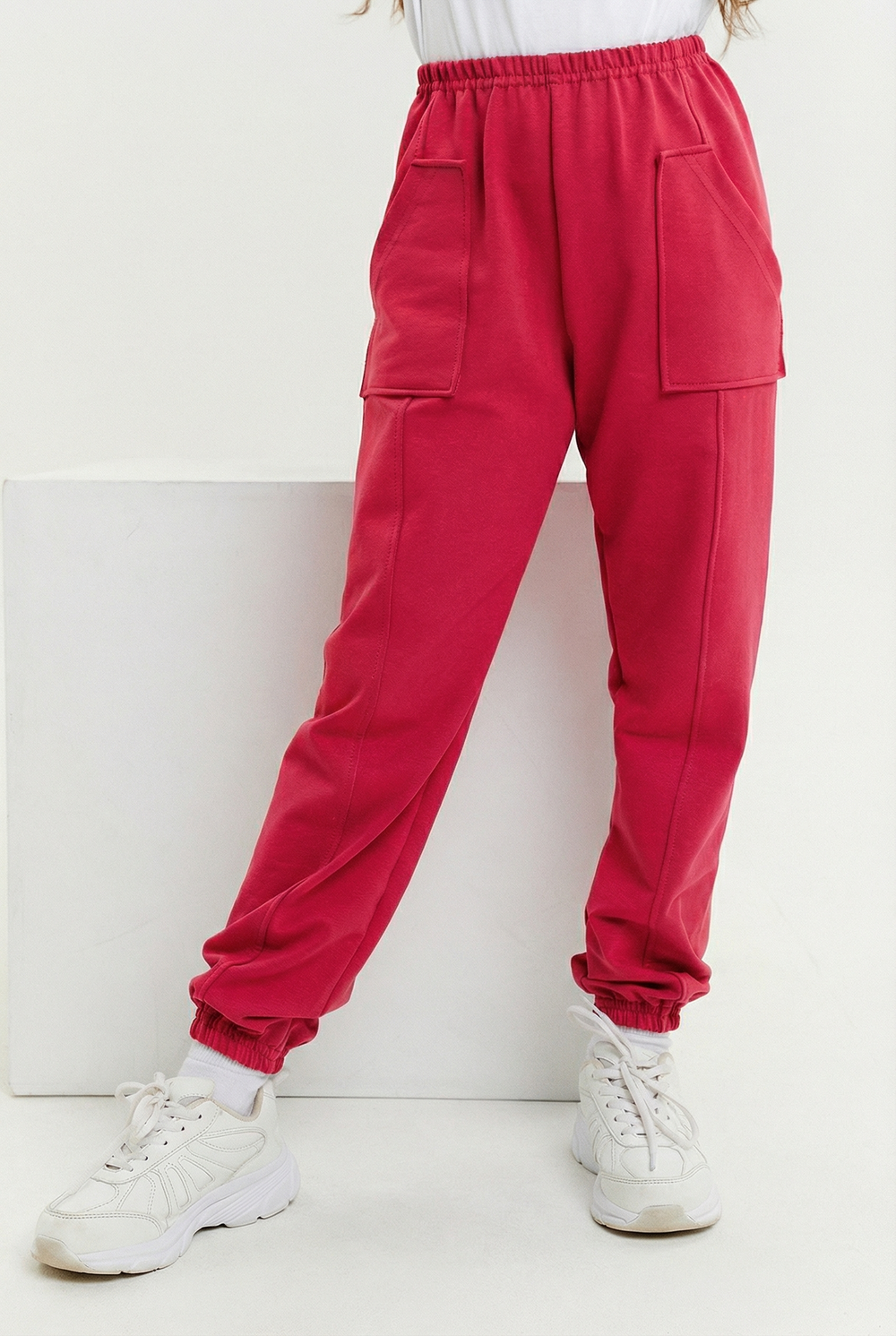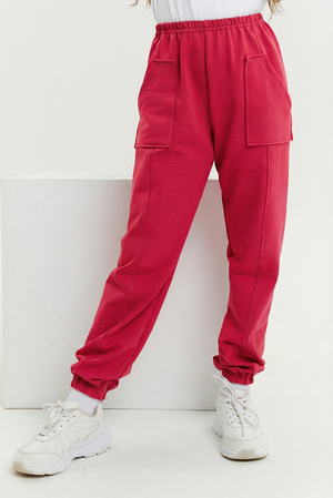 Брюки детские из футера с накладными карманами.