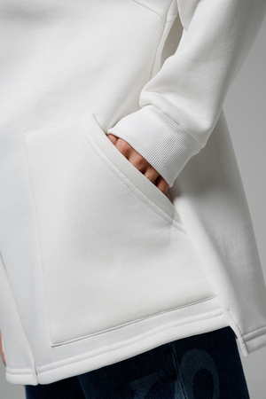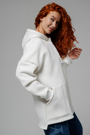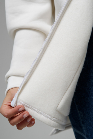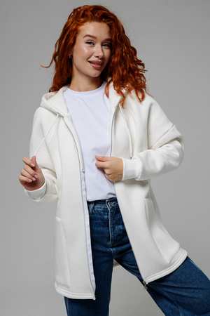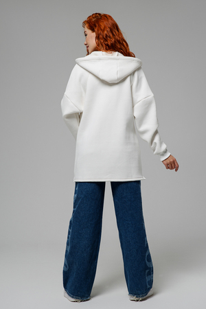 Толстовка утепленная, прямая, свободная, на молнии, с удлиненной спинкой, с капюшоном. Рукав длинный, на эластичном манжете. Полочка и спинка с фигурными кокетками. В нижней части полочки расположены удобные накладные карманы.