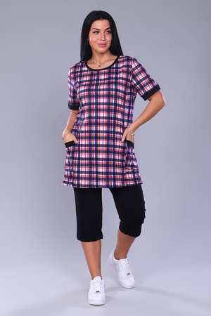 Женский костюм выполнен из 100% хлопка. Бриджи прямого кроя, пояс на резинке. Туника прямого силуэта с округлой горловиной, короткий рукав, накладные карманы.
