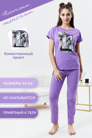 Костюм женский из кулирного полотна состоит из кофты и брюк. Кофта - прямого кроя, горловина круглая, спущенное плечо, низ изделия на поясе. Брюки слегка заужены книзу, верх на поясе с резинкой, в боковых швах внутренние карманы, низ обработан на плоскошовной машине. На полочке и брюках принт. Такой комплект отлично подойдет для дома, отдыха.