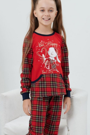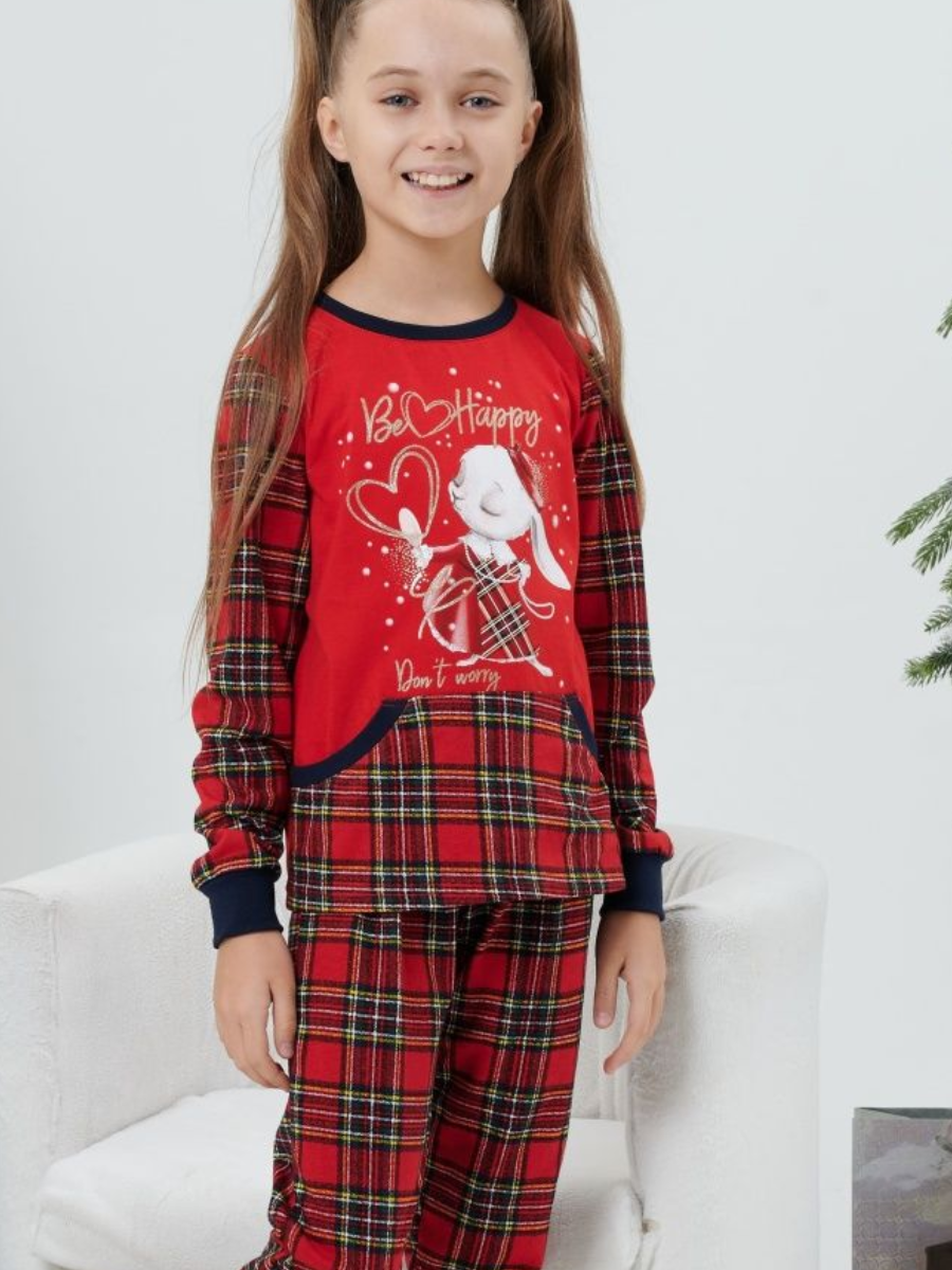 Пижама детская состоит из кофты и брюк, на полочке карман и принт.