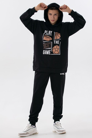 Костюм свободного кроя выполнен из футера 2-х нитки. Состоит из толстовки и брюк. Толстовка с манжетами и поясом из эластичного трикотажа. Рукав втачной со спущенной линией плеча. На полочке принт. Брюки свободной посадки с карманами и манжетами из эластичного трикотажа.