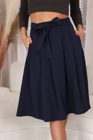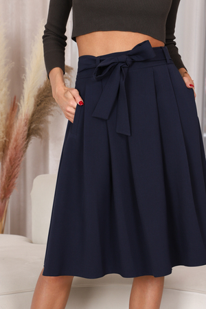 Романтичная юбка с односторонними складками, которые расходятся в разные стороны от середины юбки, не создавая лишний объем на бедрах. Для практичности по бокам выполнены карманы. В шлевки вдет пояс, который можно завязать на красивый бант.