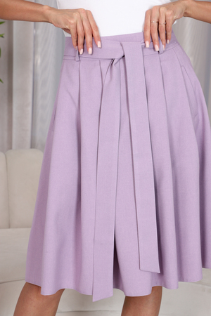 Романтичная юбка с односторонними складками, которые расходятся в разные стороны от середины юбки, не создавая лишний объем на бедрах. Для практичности по бокам выполнены карманы. В шлевки вдет пояс, который можно завязать на красивый бант.