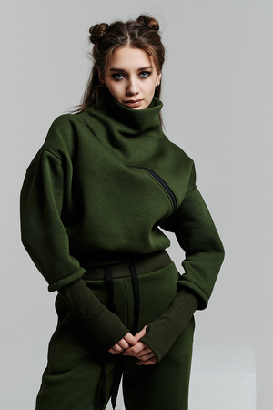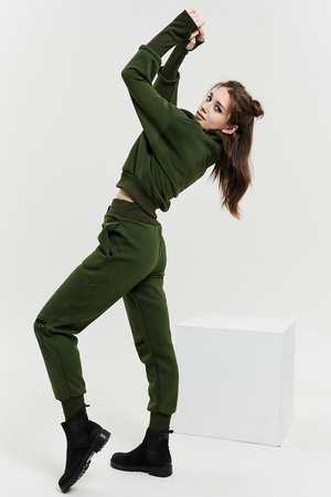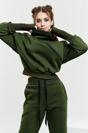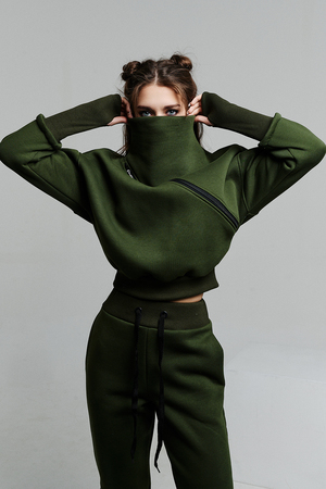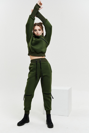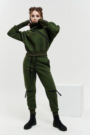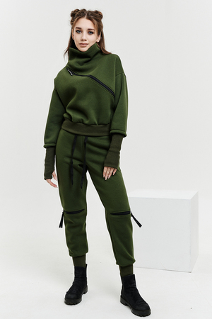 Удобный и стильный женский спортивный костюм. Состоит из свитшота и брюк-" джогеров". Толстовка и брюки оформлены функциональными, декоративными молниями. Толстовка с удобным воротником-стойкой, низ рукавов обработан высокой манжетой-перчаткойиз кашкорсе. Джогеры с высокой посадкой и широкой эластичной резинкой на поясе со шнурком. Низки брюк обработаны манжетами, что очень удобно при носке и отлично смотрятся с грубыми ботинками в стиле "челси". Спортивный костюм подходит как для зимних видов спорта, лыж, коньков, так и в холодную погоду осенью, весной.