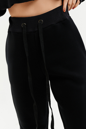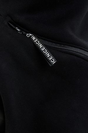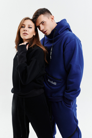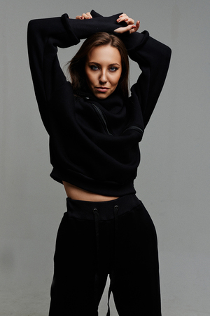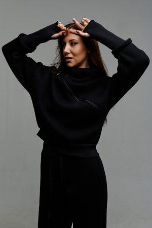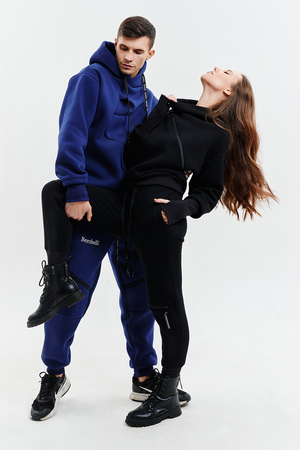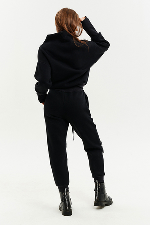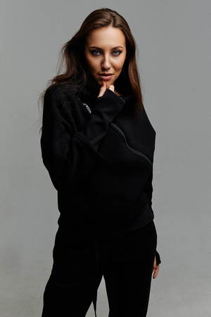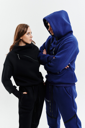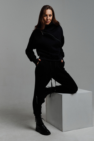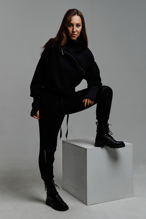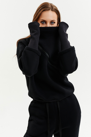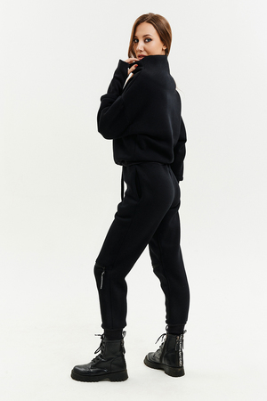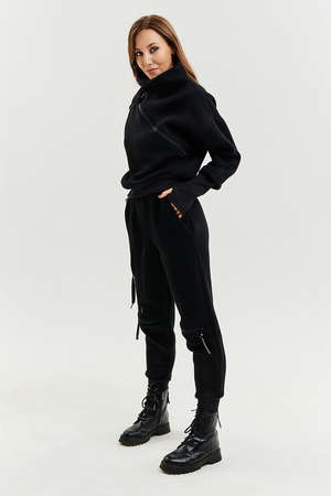 Удобный и стильный женский спортивный костюм. Состоит из свитшота и брюк-" джогеров". Толстовка и брюки оформлены функциональными, декоративными молниями. Толстовка с удобным воротником-стойкой, низ рукавов обработан высокой манжетой-перчаткойиз кашкорсе. Джогеры с высокой посадкой и широкой эластичной резинкой на поясе со шнурком. Низки брюк обработаны манжетами, что очень удобно при носке и отлично смотрятся с грубыми ботинками в стиле "челси". Спортивный костюм подходит как для зимних видов спорта, лыж, коньков, так и в холодную погоду осенью, весной.