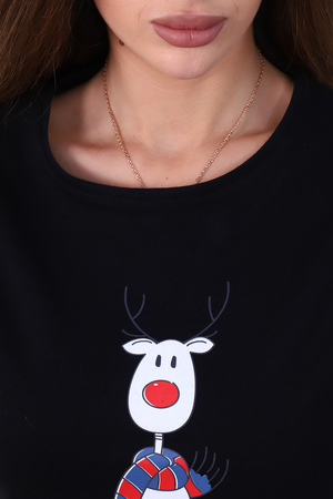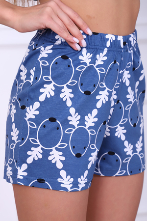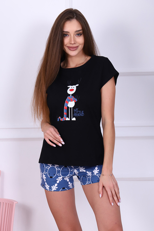 Женский домашний костюм-пижама с шортами, состоящий из футболки и шорт из трикотажного полотна 100%-го хлопка. Футболка приталенная, со спущенным плечом, который образует небольшой рукав-реглан, горловина отделана кантом из основной ткани. Шорты короткие с принтом по ткани в виде новогодних оленей. Комфортный и приятный к телу костюм не стесняет движений. Комплект идеально подойдет для дома и дачи, для отдыха и сна. Яркие, стойкие цвета ткани соответствуют модным тенденциям. Пижама дополнена милым принтом на груди. Красивая и комфортная пижама - незаменимый предмет гардероба каждой женщины. Идеально подойдет беременным и кормящим мамам. Новогодняя тематика костюма делает его отличным подарком для любимых девушек, женщин, а также по другим поводам: день рождения, 8 марта и просто без повода.