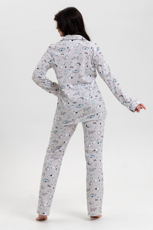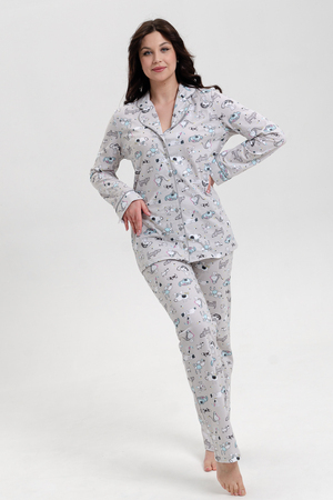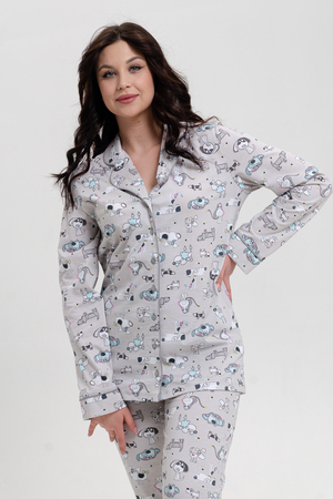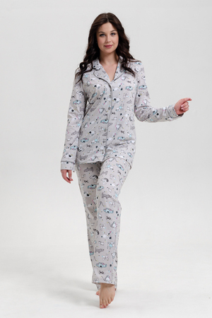 Красивая, мягкая и уютная хлопковая пижама согреет вас холодными зимними вечерами! Пижама-костюм, состоящая из прямых брюк свободной формы и легкого жакета-рубашки на центральную застежку на пуговицы с длинным рукавом. Воротник английский отложной с контрастным кантом по краю. Брюки на поясе с резинкой и блестящей тесьмой, низ с отрезной манжетой с кантом. Пижама не стесняет движений, в ней приятно спать и заниматься домашними делами. Комплект можно купить в подарок символ нового года родным и близким!