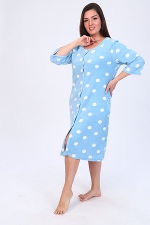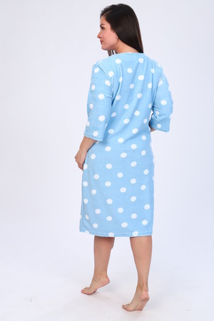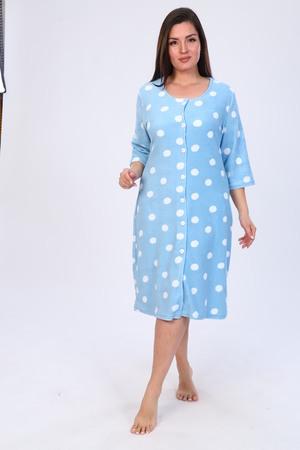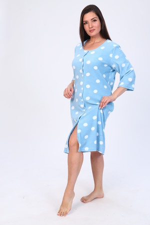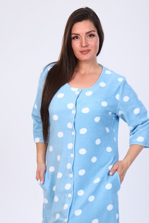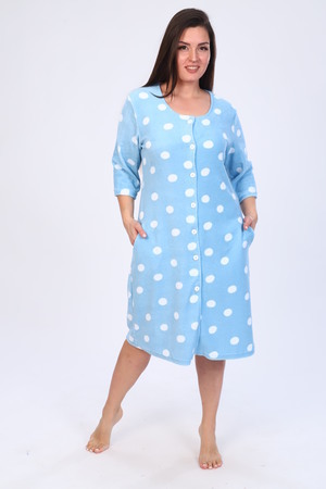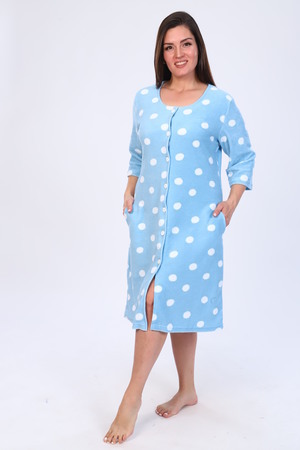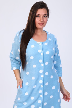 Халат женский с карманами, на пуговицах в голубой классический горошек. Мягкий и легкий халат согреет Вас в долгие осенние и зимние деньки. Халат выполнен из облегченной махры. Халат прямого силуэта, рукав 3/4. Горловина круглая с обтачкой.