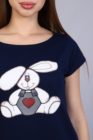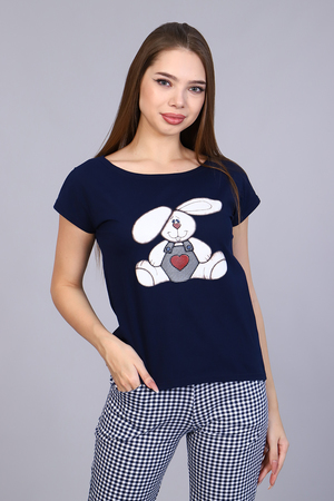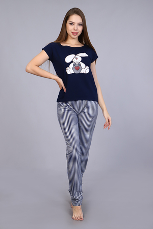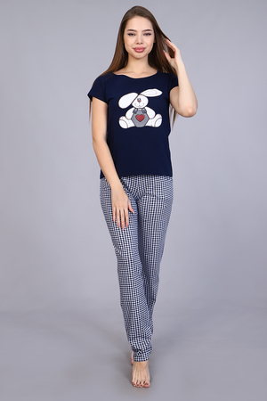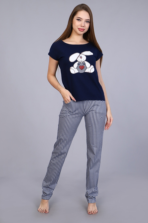 Костюм женский с принтом в виде винтажного зайчика, из мягкого 100% хлопкового трикотажа. Комплект состоит из футболки слегка приталенного силуэта и свободных брюк на притачном распошитом поясе и карманами в боковых швах. Стильный костюм для дома создаст вам комфорт и придаст уверенности в своей неотразимости.