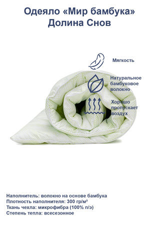 Натуральное бамбуковое волокно наполнителя обладает антибактериальным и гипоаллергенным свойством, экологично, хорошо впитывает влагу, дает ощущение свежести, прекрасно регулирует теплообмен.