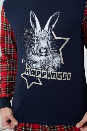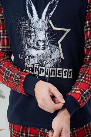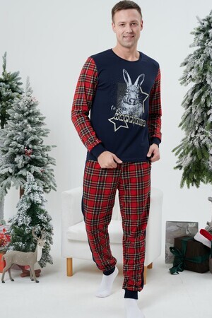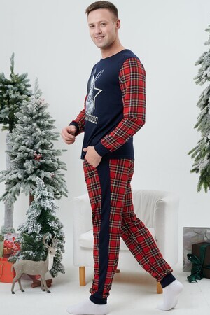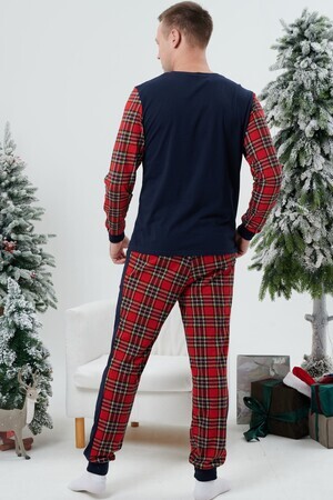Пижама мужская свободного силуэта состоит из кофты и брюк. На полочке принт. Брюки на манжете. В боковых швах карманы.