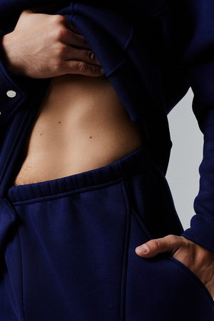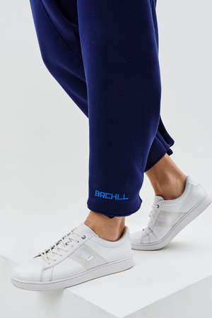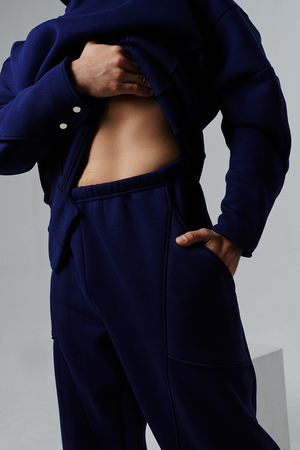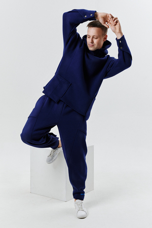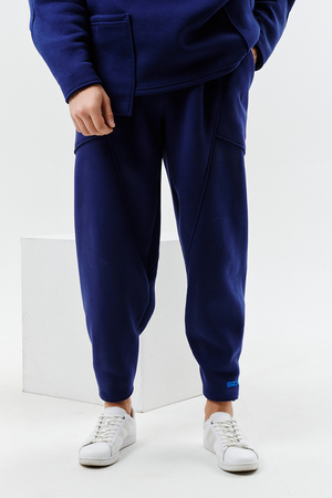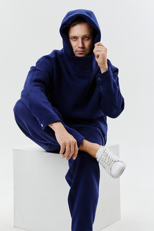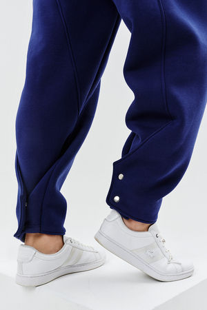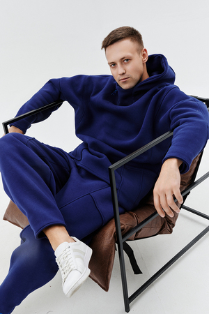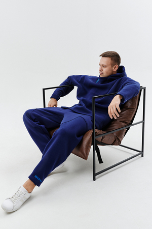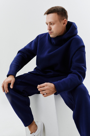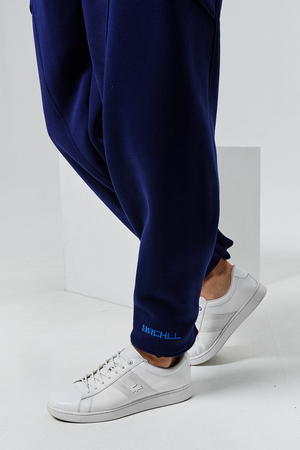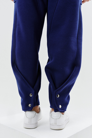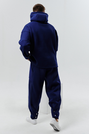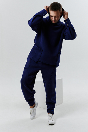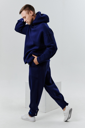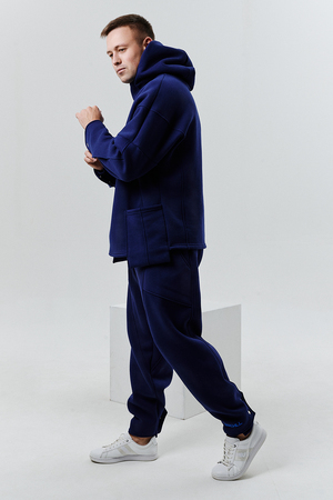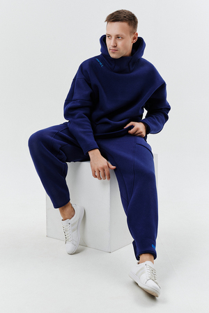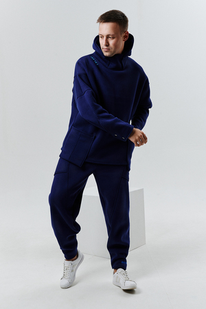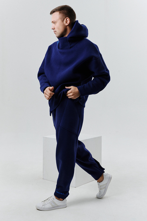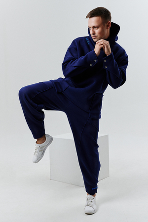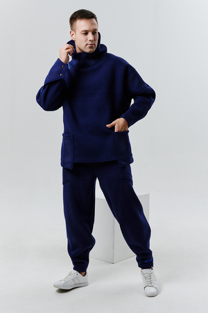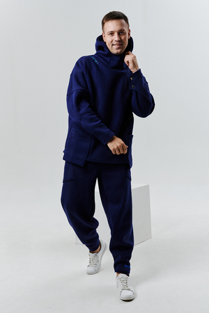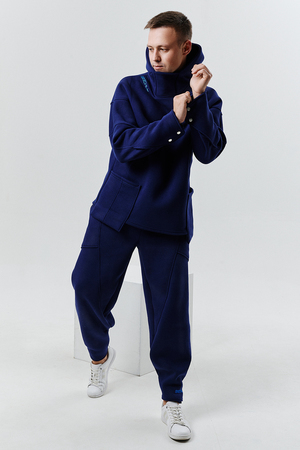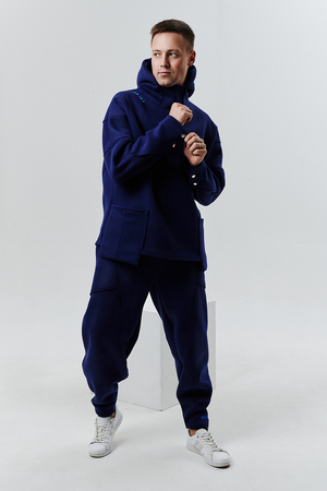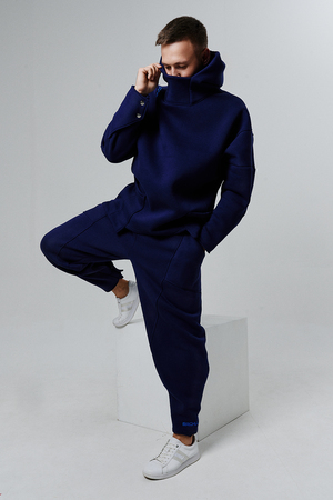 Спортивные мужские джоггеры объемного силуэта, на резинке. Сезон - осень-зима. Материал - футер с начёсом. Джоггеры с высокой посадкой на талии, также в изделии присутствуют накладные карманы, которые расположены по бокам. Спереди и сзади расположены декоративные швы. Низ левой брючины оформлен вышивкой бренда. Брючины застёгиваются на кнопку. Можно составить стильный и теплый комплект с толстовкой 7343