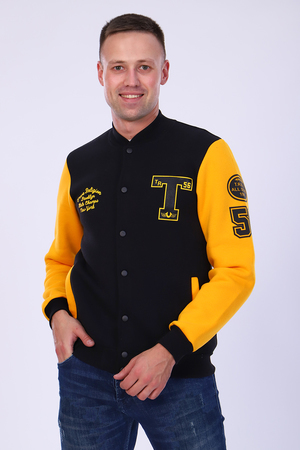 Куртка-бомбер из 3-х нитки, с воротником, на кнопках. Карманы прорезные с листочкой. Пояс, манжеты из кашкорсе. Кофта теплая и мягкая. Имеется печать на полочке и рукаве.