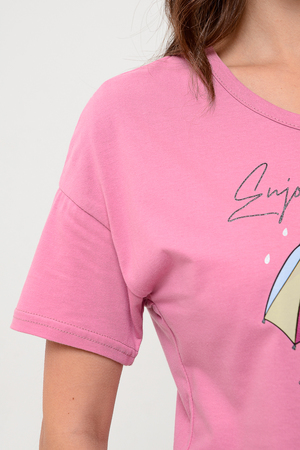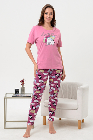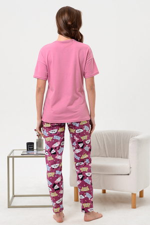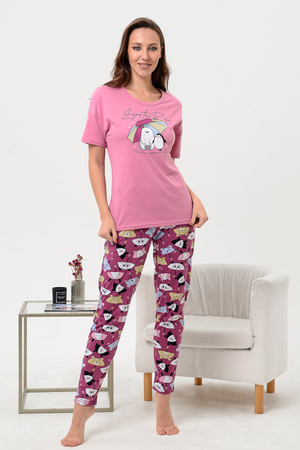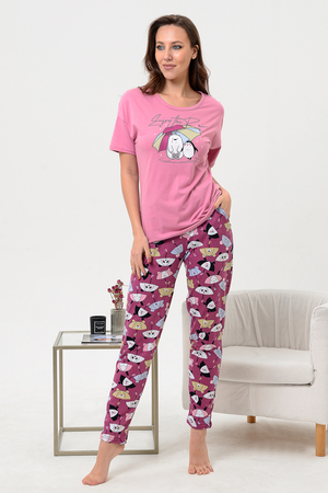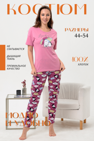 Костюм состоит из брюк и футболки. Состав 100% хлопок. Футболка прямого кроя, рукав втачной со спущенным плечом, горловина круглая, на полочке печать. Брюки зауженные книзу, подогнуты на плоскошовной машине, в боковых швах прорезные карманы. Такой костюм идеален для дома. Легок в уходе.