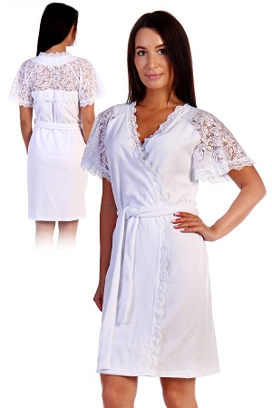 Махровый запашной халат с поясом. Декоративные вставки из кружева, длина чуть выше коленей, кружевные рукава чуть выше локтей. Три варианта расцветки — белая, ментоловая и персиковая. Размеры от 40 до 52. Имеется возможность розничного приобретения товара.