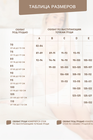 Наталия Равиловна13.05.2023 в 04:55Чашки маломерят- можно сказать даже на 2 размера. Клиент носит размер 95/D, Заказали 95/Е- чашки маленькие,