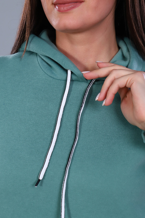 Стильное женское платье с капюшоном на люверсах. Длинный рукав, карман кенгуру, по линии талии кокетка. Удобно и практично.