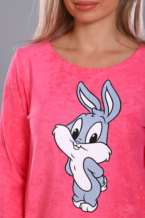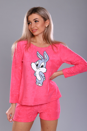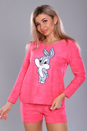 Костюм молодежный из махры. Горловина круглая, рукав длинный, по переду принт. Шортики короткие.