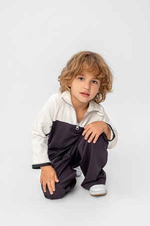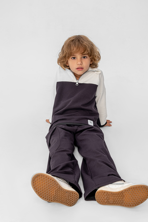 Костюм из футера двунитки. Свитшот и брюки. Свитшот дополнен нашитыми световозвращающими элементами. Брюки прямого кроя с боковыми карманами и накладным карманом на брючине.