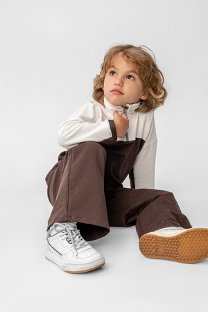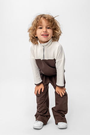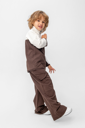 Костюм из футера двунитки. Свитшот и брюки. Свитшот дополнен нашитыми световозвращающими элементами. Брюки прямого кроя с боковыми карманами и накладным карманом на брючине.