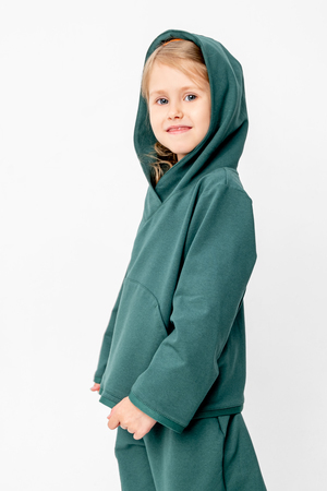 Костюм из мягкого футера двунитки двойного крашения качества пенье. Свободный крой, худи с капюшоном и накладным карманом, брюки прямые с боковыми карманами и одним накладным.