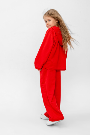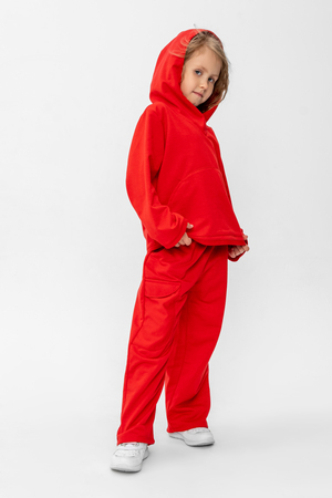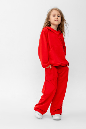 Костюм из мягкого футера двунитки двойного крашения качества пенье. Свободный крой, худи с капюшоном и накладным карманом, брюки прямые с боковыми карманами и одним накладным.