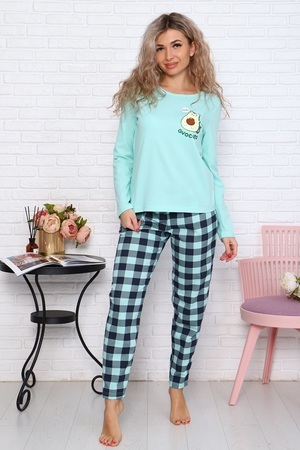 Пижама женская с длинными рукавами и с милым принтом на полочке. Стильные брюки в клетку с карманами по бокам. 100% хлопок кулирки подарит комфорт и нежность прикосновений.