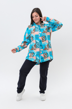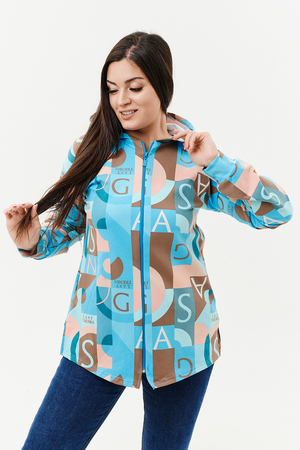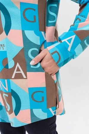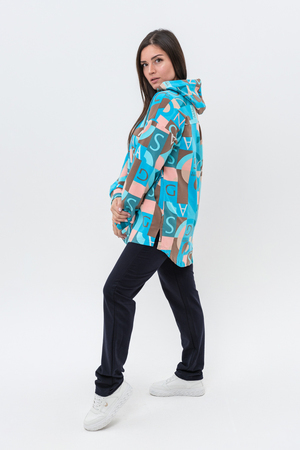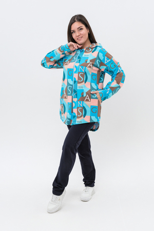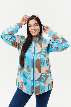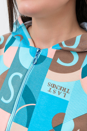 Толстовка женская выполнена из ткани футер с лайкрой. Толстовка удлиненная с красивым, модным набивным рисунком, со спущенным плечом, с капюшоном, застегивается на молнию декор (молния может быть в цвет ткани и отличаться от фото), по бокам карманы и разрезы. На спине толстовки отрезная кокетка с бантовой складкой, низ удлинен, имеет закругление. Толстовка прекрасно подойдет для прогулок, спорта и отдыха.
